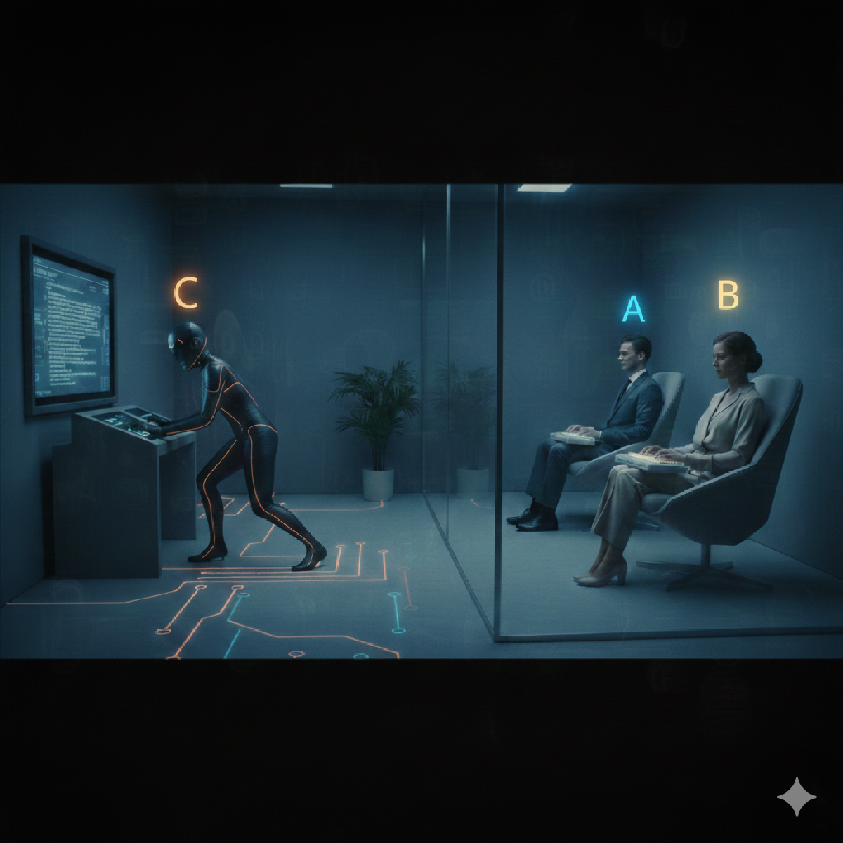 Setup: The interrogator sits in a separate room and communicates with A and B only through text — so they can’t recognize voices.